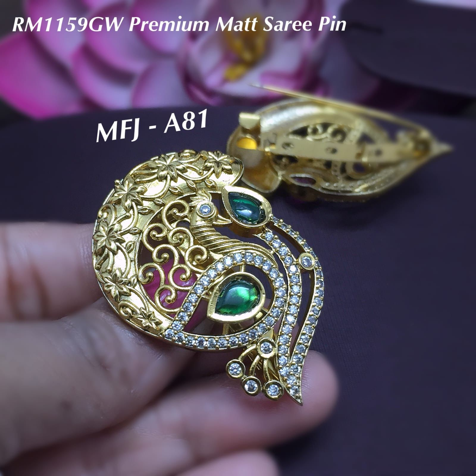 Be the first to review “MATT FINISH GREEN AND WHITE STONES PEACOCK DESIGN SAREE PIN” Cancel reply